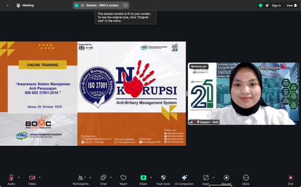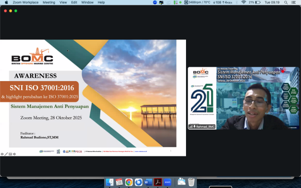 Bintan Offshore Marine Centre (BOMC) telah berhasil menyelenggarakan Pelatihan Awareness Sistem Manajemen Anti Penyuapan SNI ISO 37001:2016 pada tanggal 28 Oktober 2025. Pelatihan yang diadakan secara virtual melalui platform Zoom ini diikuti oleh partisipan dari berbagai level dan departemen di dalam organisasi, menandakan komitmen BOMC dalam membangun budaya integritas dan tata kelola perusahaan yang baik.