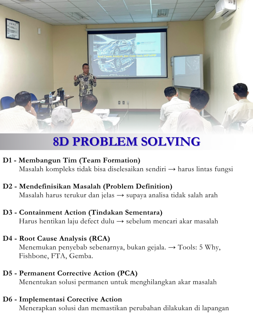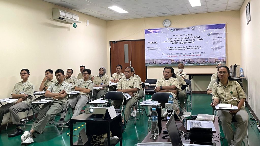 Untuk itu, penerapan Core Tools seperti APQP, FMEA, MSA, SPC, dan PPAP menjadi kerangka kerja penting dalam mengendalikan proses secara sistematis dan berbasis data. FMEA membantu mengidentifikasi potensi penyebab dan dampak kegagalan, SPC memantau kestabilan proses, dan MSA memastikan keandalan sistem pengukuran. Jika hasil Root Cause Analysis (RCA) tidak dikaitkan dengan Core Tools tersebut, maka upaya perbaikan akan terpisah dan tidak terintegrasi dengan sistem pengendalian proses. Oleh karena itu, pelatihan RCA yang terintegrasi dengan Core Tools merupakan langkah proaktif untuk meningkatkan efektivitas tindakan korektif dan pencegahan secara berkelanjutan.