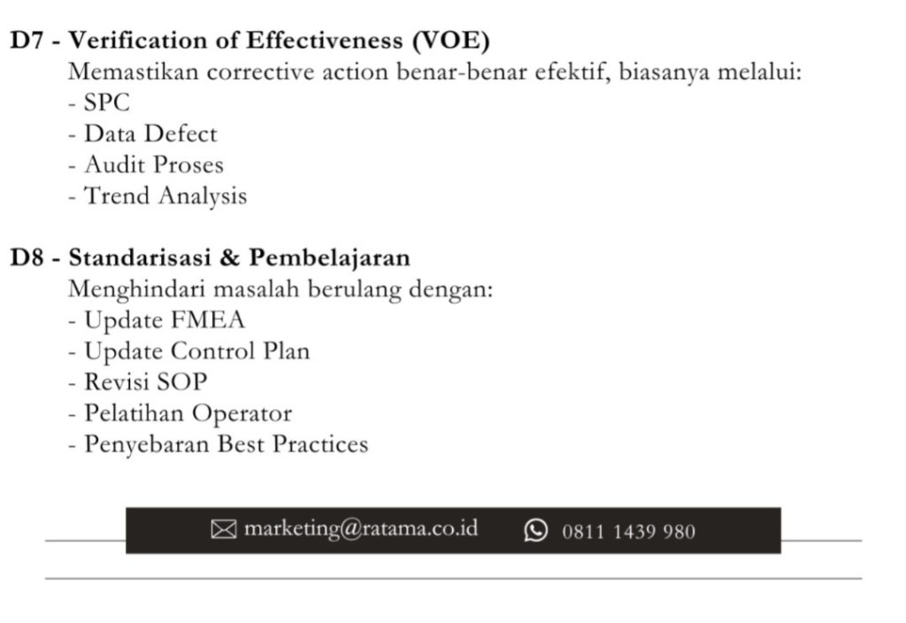 Metode 8D dirancang sebagai pendekatan sistematis untuk menangani masalah yang kompleks dan berulang, terutama dalam lingkungan industri berisiko tinggi. Dalam kerangka 8D, RCA menjadi inti utama pada tahap D4 (Root Cause Analysis). Pada tahap ini, fokus tidak hanya pada “apa yang salah”, tetapi pada “mengapa masalah tersebut bisa terjadi” dan “mengapa sistem gagal mencegahnya”.