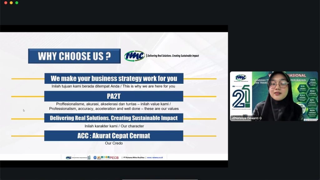 Kolaborasi antara RMC sebagai konsultan dan BSII sebagai lembaga yang memiliki kompetensi dalam bidang standar dan sertifikasi memberikan nilai tambah dalam penyelenggaraan webinar ini. Sinergi ini menghadirkan perspektif yang lebih lengkap, mulai dari pemahaman implementasi hingga kesiapan organisasi dalam menghadapi proses audit dan sertifikasi.